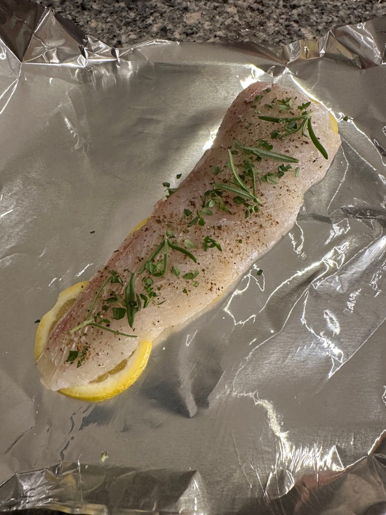 - Place fresh herbs on top of the fillet (we used thyme, rosemary, and oregano from our garden).